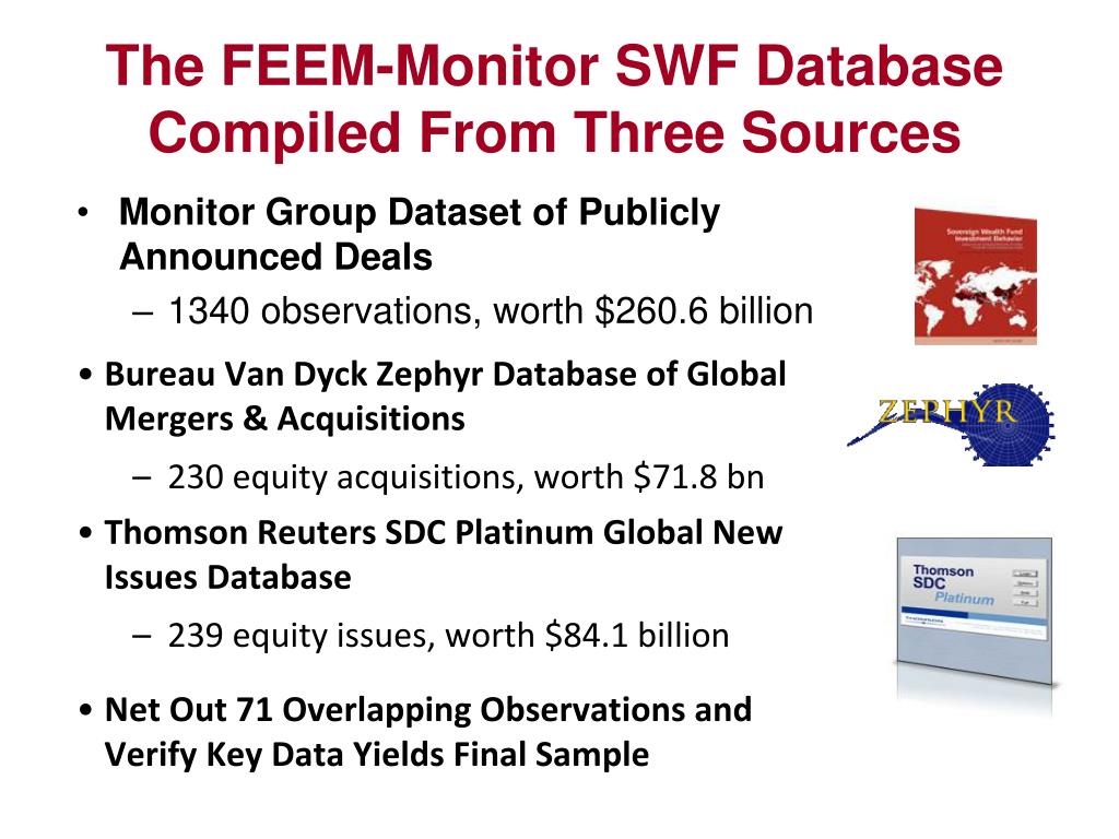 The FEEM-Monitor SWF Database Compiled From Three Sources • Monitor Group Dataset of Publicly Announced Deals • 1340 observations, worth $260.6 billion • Bureau Van Dyck Zephyr Database of Global Mergers & Acquisitions • 230 equity acquisitions, worth $71.8 bn • Thomson Reuters SDC Platinum Global New Issues Database • 239 equity issues, worth $84.1 billion • Net Out 71 Overlapping Observations and Verify Key Data Yields Final Sample