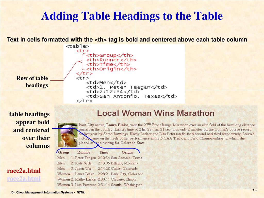 Row of table headings table headings appear bold and centered over their columns Adding Table Headings to the Table Text in cells formatted with the <th> tag is bold and centered above each table column race2a.html race2a.html