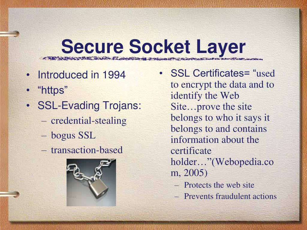 Introduced in 1994 “https” SSL-Evading Trojans: credential-stealing bogus SSL transaction-based SSL Certificates= “used to encrypt the data and to identify the Web Site…prove the site belongs to who it says it belongs to and contains information about the certificate holder…”(Webopedia.com, 2005) Protects the web site Prevents fraudulent actions Secure Socket Layer