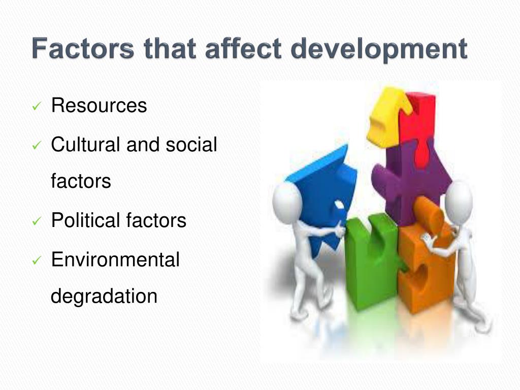 Frameworks for development. Factors that affect development. Factors that affect development. Resources Cultural and social factors Political factors Environmental degradation. 1. Resources. This refers to anything that people can use to improve their living conditions .