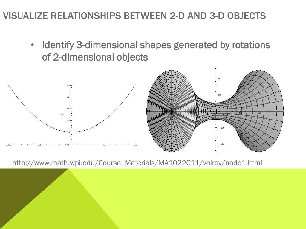 Visualize relationships between 2-D and 3-D objects • Identify 3-dimensional shapes generated by rotations of 2-dimensional objects http://www.math.wpi.edu/Course_Materials/MA1022C11/volrev/node1.html
