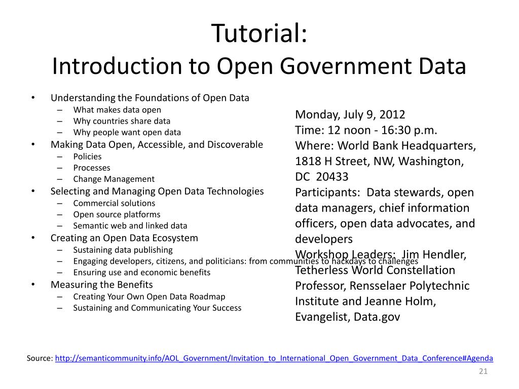 Tutorial:Introduction to Open Government Data • Understanding the Foundations of Open Data • What makes data open • Why countries share data • Why people want open data • Making Data Open, Accessible, and Discoverable • Policies • Processes • Change Management • Selecting and Managing Open Data Technologies • Commercial solutions • Open source platforms • Semantic web and linked data • Creating an Open Data Ecosystem • Sustaining data publishing • Engaging developers, citizens, and politicians: from communities to hackdays to challenges • Ensuring use and economic benefits • Measuring the Benefits • Creating Your Own Open Data Roadmap • Sustaining and Communicating Your Success Monday, July 9, 2012 Time: 12 noon - 16:30 p.m. Where: World Bank Headquarters, 1818 H Street, NW, Washington, DC 20433 Participants: Data stewards, open data managers, chief information officers, open data advocates, and developers Workshop Leaders: Jim Hendler, Tetherless World Constellation Professor, Rensselaer Polytechnic Institute and Jeanne Holm, Evangelist, Data.gov Source: http://semanticommunity.info/AOL_Government/Invitation_to_International_Open_Government_Data_Conference#Agenda