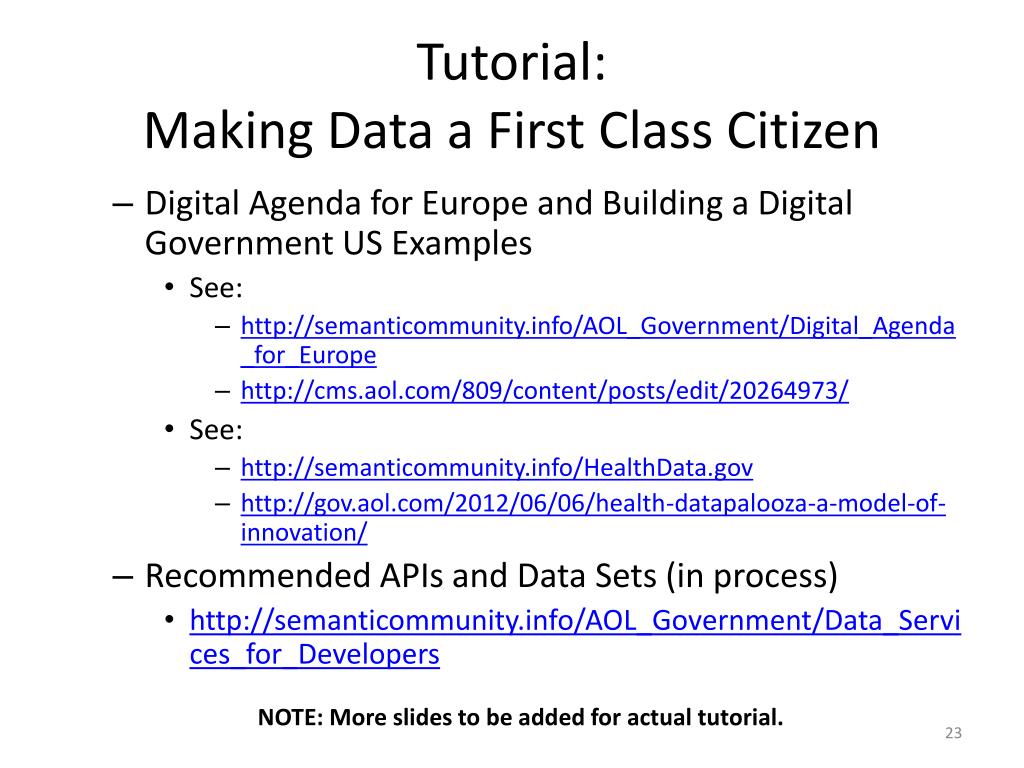 Tutorial:Making Data a First Class Citizen • Digital Agenda for Europe and Building a Digital Government US Examples • See: • http://semanticommunity.info/AOL_Government/Digital_Agenda_for_Europe • http://cms.aol.com/809/content/posts/edit/20264973/ • See: • http://semanticommunity.info/HealthData.gov • http://gov.aol.com/2012/06/06/health-datapalooza-a-model-of-innovation/ • Recommended APIs and Data Sets (in process) • http://semanticommunity.info/AOL_Government/Data_Services_for_Developers NOTE: More slides to be added for actual tutorial.