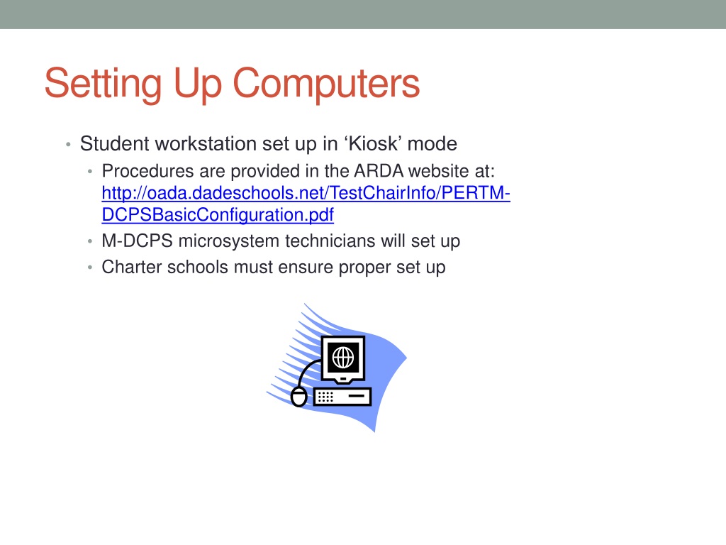 Setting Up Computers • Student workstation set up in ‘Kiosk’ mode • Procedures are provided in the ARDA website at: http://oada.dadeschools.net/TestChairInfo/PERTM-DCPSBasicConfiguration.pdf • M-DCPS microsystem technicians will set up • Charter schools must ensure proper set up