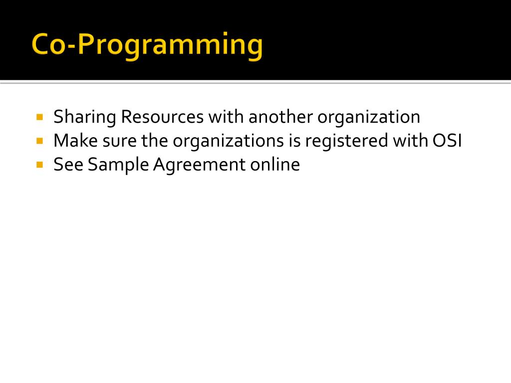 Co-Programming • Sharing Resources with another organization • Make sure the organizations is registered with OSI • See Sample Agreement online