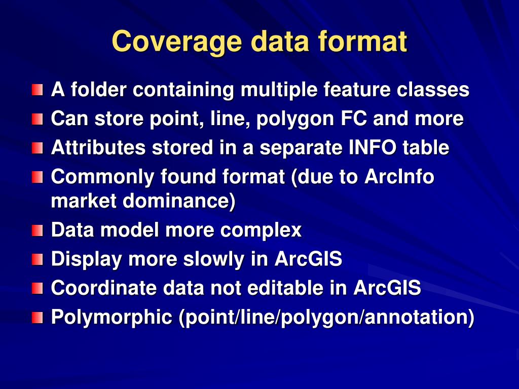 Coverage data format • A folder containing multiple feature classes • Can store point, line, polygon FC and more • Attributes stored in a separate INFO table • Commonly found format (due to ArcInfo market dominance) • Data model more complex • Display more slowly in ArcGIS • Coordinate data not editable in ArcGIS • Polymorphic (point/line/polygon/annotation)
