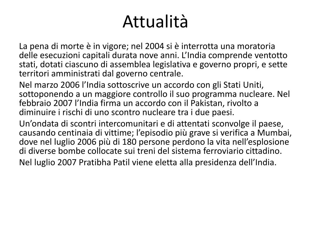 Attualità La pena di morte è in vigore; nel 2004 si è interrotta una moratoria delle esecuzioni capitali durata nove anni. L’India comprende ventotto stati, dotati ciascuno di assemblea legislativa e governo propri, e sette territori amministrati dal governo centrale. Nel marzo 2006 l’India sottoscrive un accordo con gli Stati Uniti, sottoponendo a un maggiore controllo il suo programma nucleare. Nel febbraio 2007 l’India firma un accordo con il Pakistan, rivolto a diminuire i rischi di uno scontro nucleare tra i due paesi. Un’ondata di scontri intercomunitari e di attentati sconvolge il paese, causando centinaia di vittime; l’episodio più grave si verifica a Mumbai, dove nel luglio 2006 più di 180 persone perdono la vita nell’esplosione di diverse bombe collocate sui treni del sistema ferroviario cittadino. Nel luglio 2007 PratibhaPatil viene eletta alla presidenza dell’India.