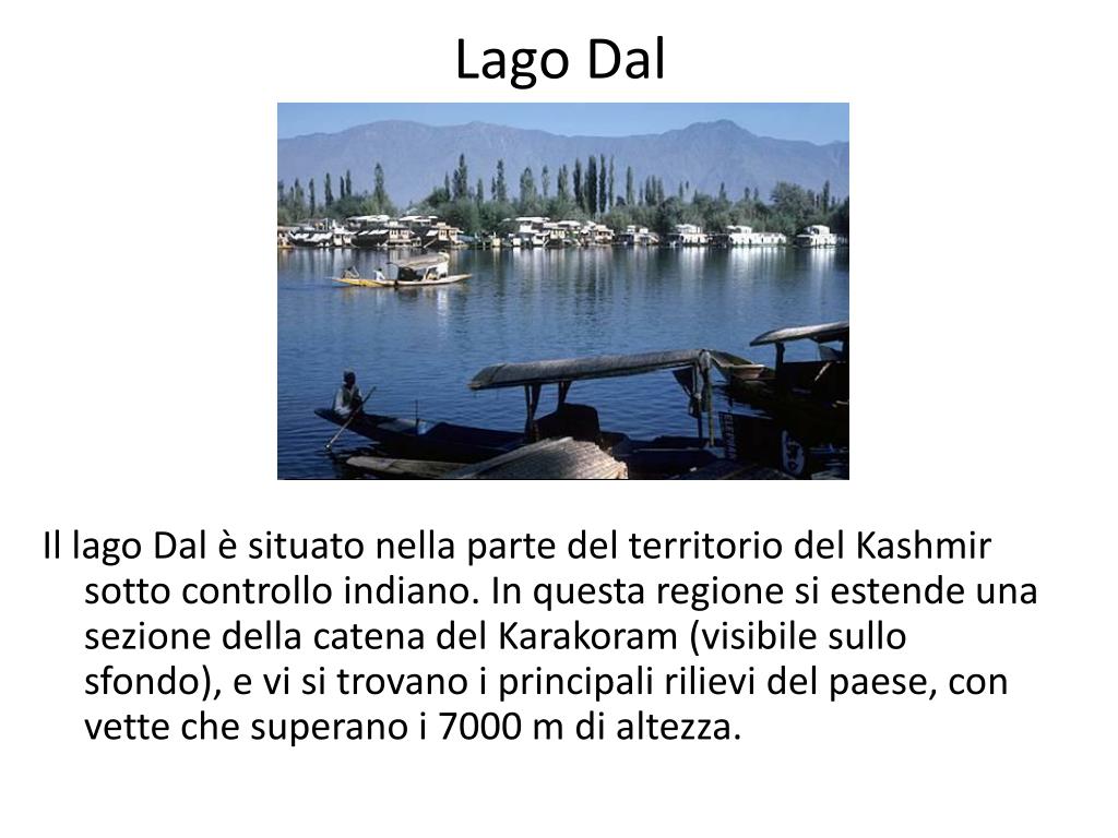 Lago Dal Il lago Dal è situato nella parte del territorio del Kashmir sotto controllo indiano. In questa regione si estende una sezione della catena del Karakoram (visibile sullo sfondo), e vi si trovano i principali rilievi del paese, con vette che superano i 7000 m di altezza.