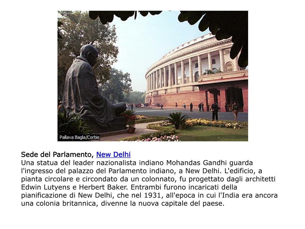 Sede del Parlamento, New Delhi Una statua del leader nazionalista indiano Mohandas Gandhi guarda l'ingresso del palazzo del Parlamento indiano, a New Delhi. L'edificio, a pianta circolare e circondato da un colonnato, fu progettato dagli architetti Edwin Lutyens e Herbert Baker. Entrambi furono incaricati della pianificazione di New Delhi, che nel 1931, all'epoca in cui l'India era ancora una colonia britannica, divenne la nuova capitale del paese.