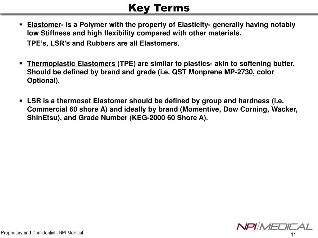 Key Terms • Elastomer- is a Polymer with the property of Elasticity- generally having notably low Stiffness and high flexibility compared with other materials. TPE’s, LSR’s and Rubbers are all Elastomers. • Thermoplastic Elastomers (TPE) are similar to plastics- akin to softening butter. Should be defined by brand and grade (i.e. QST Monprene MP-2730, color Optional). • LSR is a thermoset Elastomer should be defined by group and hardness (i.e. Commercial 60 shore A) and ideally by brand (Momentive, Dow Corning, Wacker, ShinEtsu),and Grade Number (KEG-2000 60 Shore A).