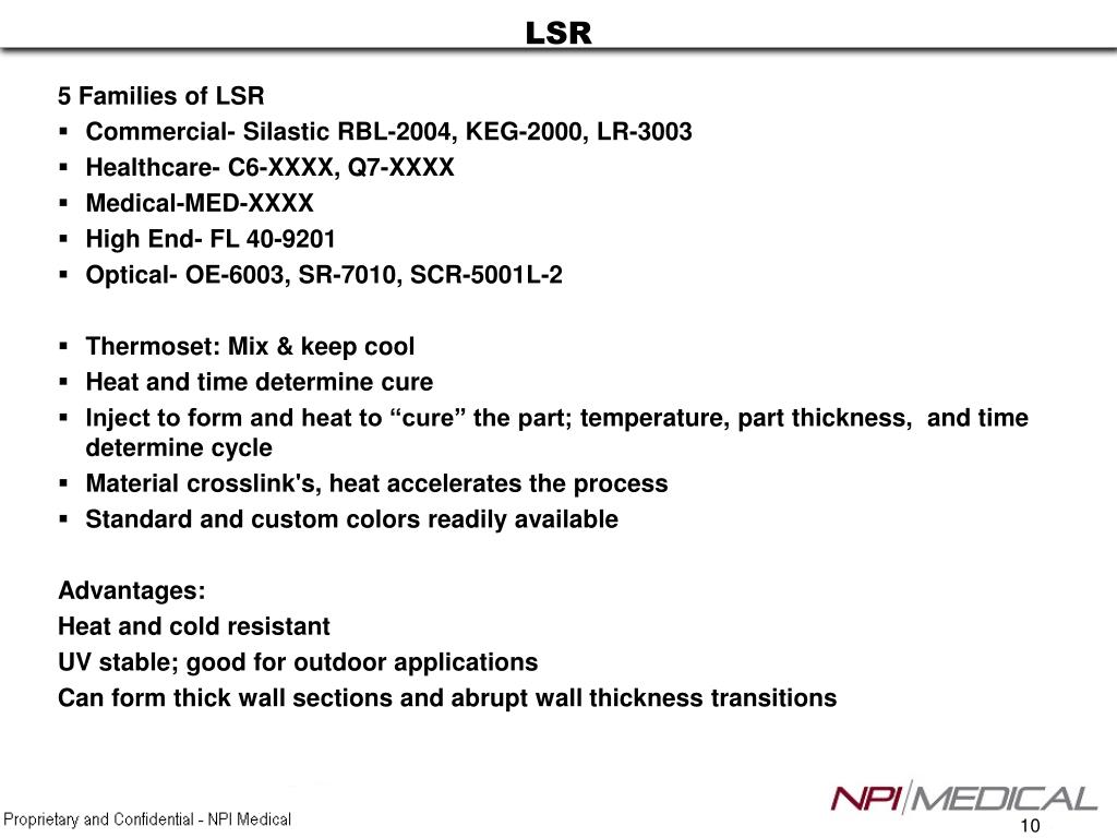 LSR/LIM (Liquid Silicone Rubber /Liquid Injection Molding) • LSR’s developed in early 1970’s, and in the late 1970’s a “pumpable” silicone rubber was developed and available to fabricators. • Raw Material comes from one of earths elements- Silicon (a ROCK). • Liquid Injection Molded Liquid Silicone Rubbers involves lower viscosity two component flowablepastes with typical viscosities from 10,000 to 1,000,000 cps. • Two components (“A” & “B”) are kept separate and have extended shelf lives (6-months to years) if kept in closed containers. • RTV’s and LIM are part of NPI core technology.
