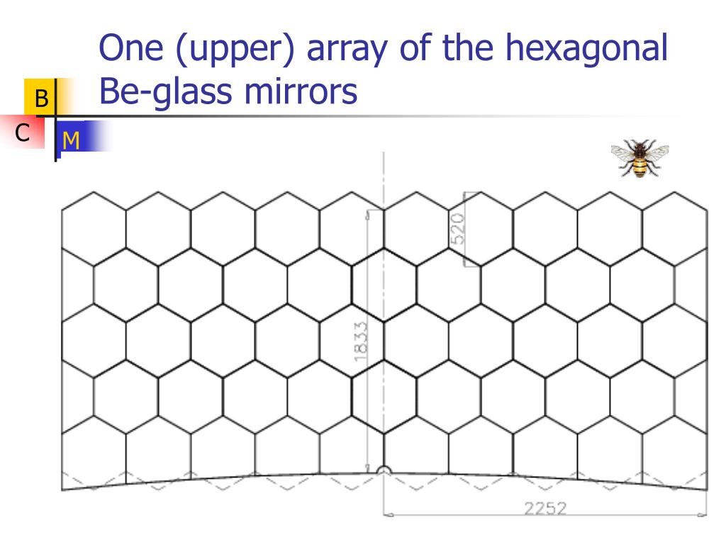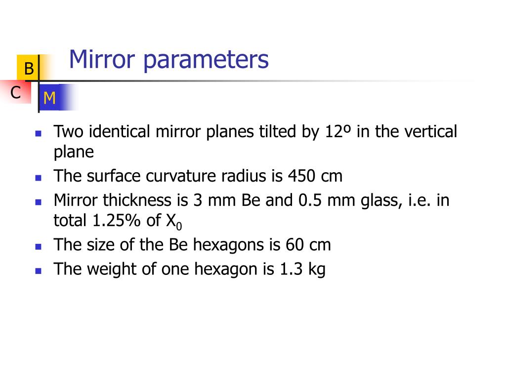 Mirror parameters • Two identical mirror planes tilted by 12º in the vertical plane • The surface curvature radius is 450 cm • Mirror thickness is 3 mm Be and 0.5 mm glass, i.e. in total 1.25% of X0 • The size of the Be hexagons is 60 cm • The weight of one hexagon is 1.3 kg