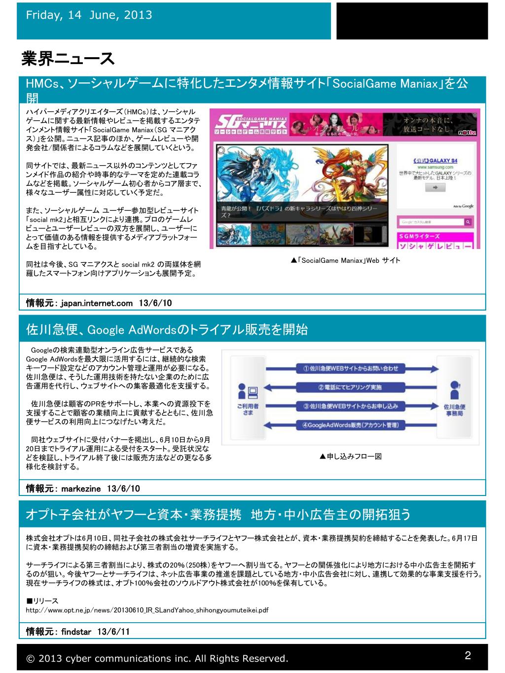 Friday, 14 June, 2013 業界ニュース HMCs、ソーシャルゲームに特化したエンタメ情報サイト「SocialGame Maniax」を公開 ハイパーメディアクリエイターズ(HMCs)は、ソーシャルゲームに関する最新情報やレビューを掲載するエンタテインメント情報サイト「SocialGame Maniax(SG マニアクス)」を公開。ニュース記事のほか、ゲームレビューや開発会社/関係者によるコラムなどを展開していくという。 同サイトでは、最新ニュース以外のコンテンツとしてファンメイド作品の紹介や時事的なテーマを定めた連載コラムなどを掲載。ソーシャルゲーム初心者からコア層まで、様々なユーザー属性に対応していく予定だ。 また、ソーシャルゲーム ユーザー参加型レビューサイト「social mk2」と相互リンクにより連携。プロのゲームレビューとユーザーレビューの双方を展開し、ユーザーにとって価値のある情報を提供するメディアプラットフォームを目指すとしている。 同社は今後、SG マニアクスと social mk2 の両媒体を網羅したスマートフォン向けアプリケーションも展開予定。 ▲「SocialGame Maniax」Web サイト 情報元: japan.internet.com13/6/10 佐川急便、Google AdWordsのトライアル販売を開始 Googleの検索連動型オンライン広告サービスであるGoogle AdWordsを最大限に活用するには、継続的な検索キーワード設定などのアカウント管理と運用が必要になる。佐川急便は、そうした運用技術を持たない企業のために広告運用を代行し、ウェブサイトへの集客最適化を支援する。 佐川急便は顧客のPRをサポートし、本業への資源投下を支援することで顧客の業績向上に貢献するとともに、佐川急便サービスの利用向上につなげたい考えだ。 同社ウェブサイトに受付バナーを掲出し、6月10日から9月20日までトライアル運用による受付をスタート。受託状況などを検証し、トライアル終了後には販売方法などの更なる多様化を検討する。 ▲申し込みフロー図 情報元: markezine13/6/10 オプト子会社がヤフーと資本・業務提携 地方・中小広告主の開拓狙う 株式会社オプトは6月10日、同社子会社の株式会社サーチライフとヤフー株式会社とが、資本・業務提携契約を締結することを発表した。6月17日に資本・業務提携契約の締結および第三者割当の増資を実施する。 サーチライフによる第三者割当により、株式の20%(250株)をヤフーへ割り当てる。ヤフーとの関係強化により地方における中小広告主を開拓するのが狙い。今後ヤフーとサーチライフは、ネット広告事業の推進を課題としている地方・中小広告会社に対し、連携して効果的な事業支援を行う。 現在サーチライフの株式は、オプト100%会社のソウルドアウト株式会社が100%を保有している。 ■リリース http://www.opt.ne.jp/news/20130610_IR_SLandYahoo_shihongyoumuteikei.pdf 情報元: findstar13/6/11