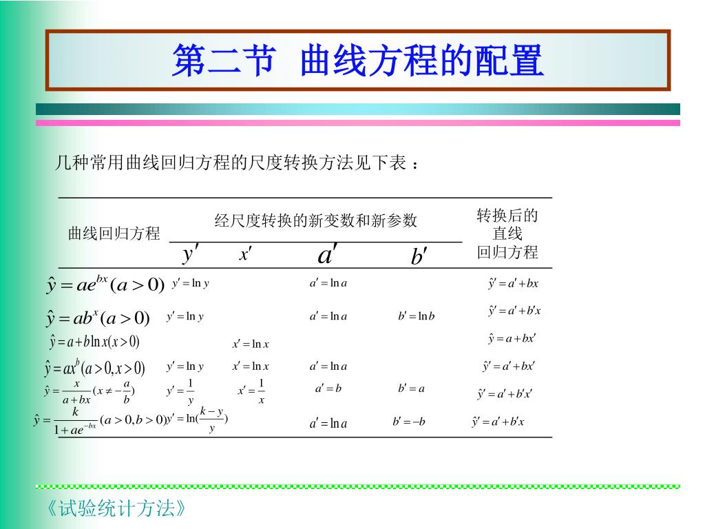 第二节 曲线方程的配置 几种常用曲线回归方程的尺度转换方法见下表 : 《试验统计方法》