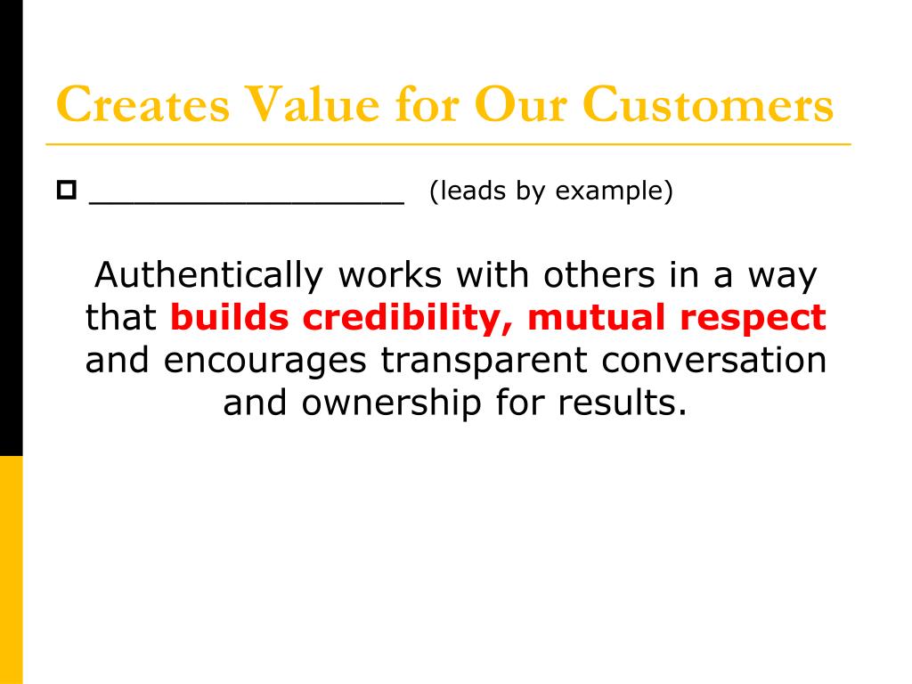 Creates Value for Our Customers • ______________ (leads by example) Authentically works with others in a way that builds credibility, mutual respect and encourages transparent conversation and ownership for results.