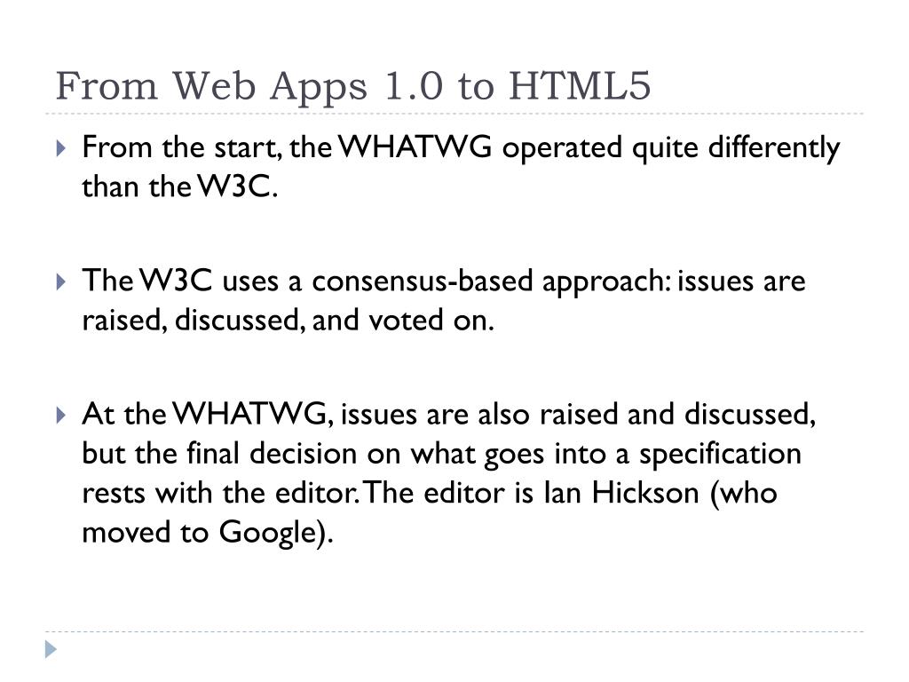 From Web Apps 1.0 to HTML5 • From the start, the WHATWG operated quite differently than the W3C. • The W3C uses a consensus-based approach: issues are raised, discussed, and voted on. • At the WHATWG, issues are also raised and discussed, but the final decision on what goes into a specification rests with the editor. The editor is Ian Hickson (who moved to Google).