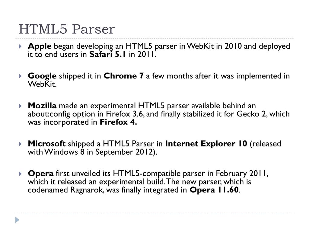 HTML5 Parser • Apple began developing an HTML5 parser in WebKit in 2010 and deployed it to end users in Safari 5.1 in 2011. • Google shipped it in Chrome 7 a few months after it was implemented in WebKit. • Mozilla made an experimental HTML5 parser available behind an about:config option in Firefox 3.6, and finally stabilized it for Gecko 2, which was incorporated in Firefox 4. • Microsoftshipped a HTML5 Parser in Internet Explorer 10 (released with Windows 8 in September 2012). • Opera first unveiled its HTML5-compatible parser in February 2011, which it released an experimental build. The new parser, which is codenamed Ragnarok, was finally integrated in Opera 11.60.