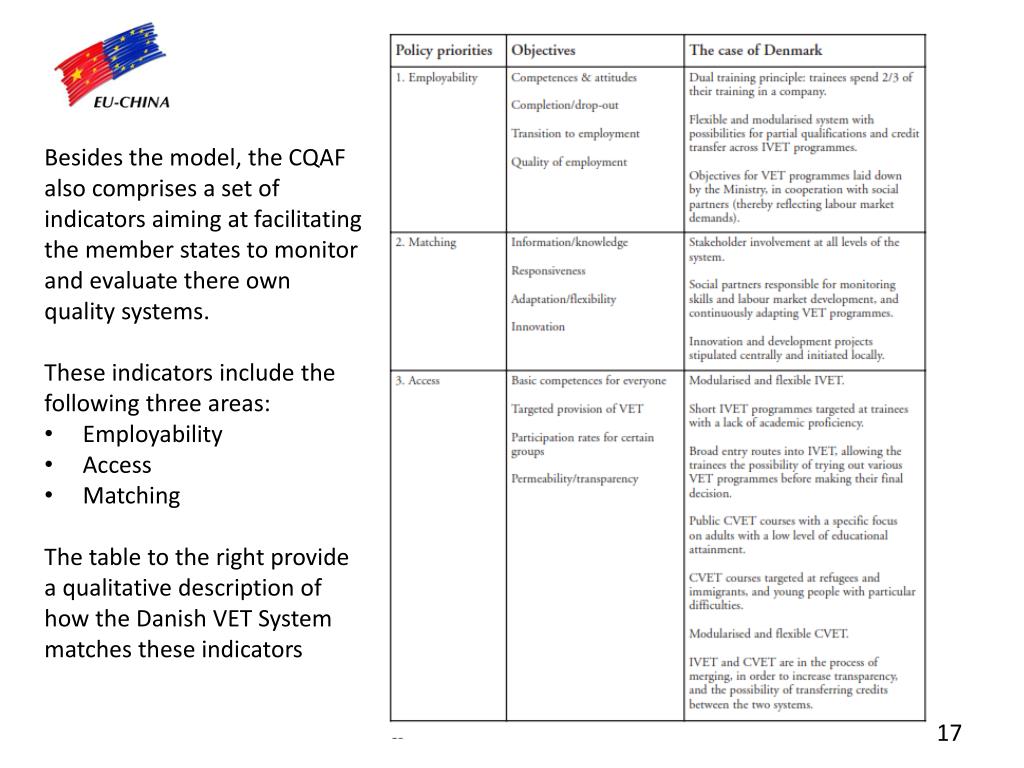 Besides the model, the CQAF also comprises a set of indicators aiming at facilitating the member states to monitor and evaluate there own quality systems. • These indicators include the following three areas: • Employability • Access • Matching • The table to the right provide a qualitative description of how the Danish VET System matches these indicators