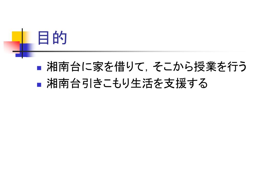 目的 • 湘南台に家を借りて,そこから授業を行う • 湘南台引きこもり生活を支援する