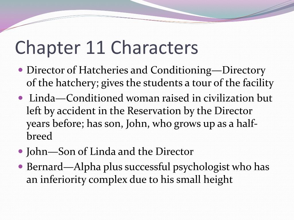 Chapter 11 Characters • Director of Hatcheries and Conditioning—Directory of the hatchery; gives the students a tour of the facility • Linda—Conditioned woman raised in civilization but left by accident in the Reservation by the Director years before; has son, John, who grows up as a half-breed • John—Son of Linda and the Director • Bernard—Alpha plus successful psychologist who has an inferiority complex due to his small height