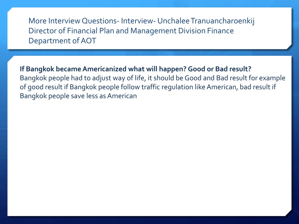 More Interview Questions- Interview- UnchaleeTranuancharoenkijDirector of Financial Plan and Management Division Finance Department of AOT If Bangkok became Americanized what will happen? Good or Bad result? Bangkok people had to adjust way of life, it should be Good and Bad result for example of good result if Bangkok people follow traffic regulation like American, bad result if Bangkok people save less as American