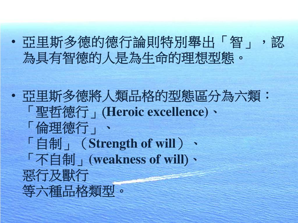 亞里斯多德的德行論則特別舉出「智」,認為具有智德的人是為生命的理想型態。亞里斯多德的德行論則特別舉出「智」,認為具有智德的人是為生命的理想型態。 • 亞里斯多德將人類品格的型態區分為六類:「聖哲德行」(Heroic excellence)、「倫理德行」、「自制」(Strength of will)、「不自制」(weakness of will)、惡行及獸行等六種品格類型。