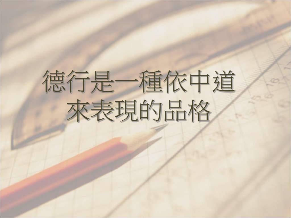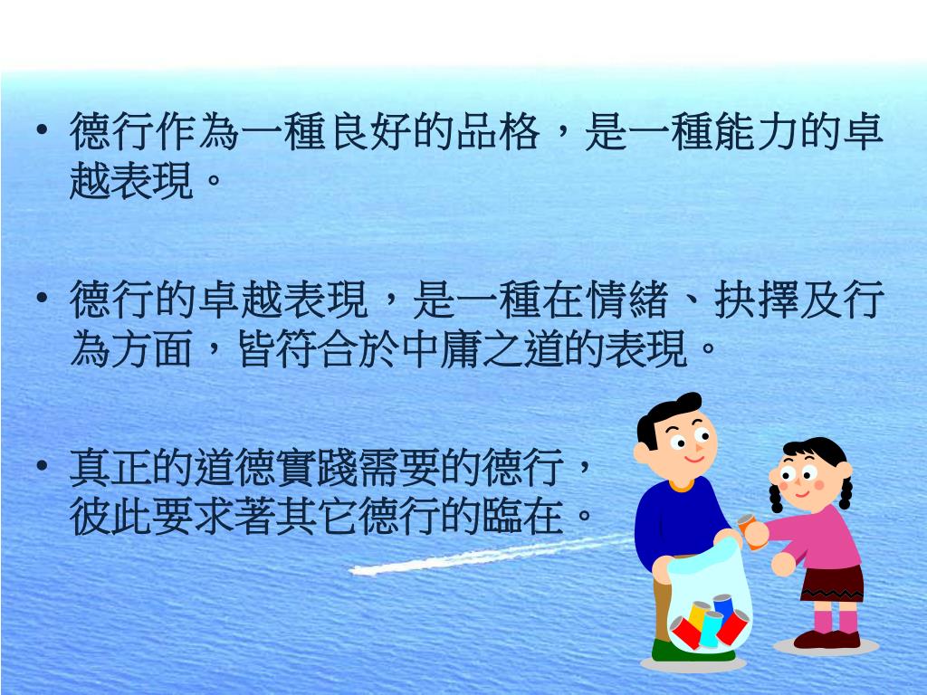德行作為一種良好的品格,是一種能力的卓越表現。德行作為一種良好的品格,是一種能力的卓越表現。 • 德行的卓越表現,是一種在情緒、抉擇及行為方面,皆符合於中庸之道的表現。 • 真正的道德實踐需要的德行,彼此要求著其它德行的臨在。