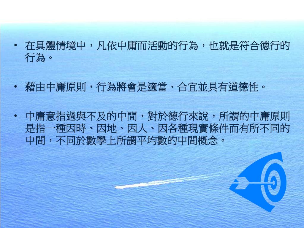 在具體情境中,凡依中庸而活動的行為,也就是符合德行的行為。在具體情境中,凡依中庸而活動的行為,也就是符合德行的行為。 • 藉由中庸原則,行為將會是適當、合宜並具有道德性。 • 中庸意指過與不及的中間,對於德行來說,所謂的中庸原則是指一種因時、因地、因人、因各種現實條件而有所不同的中間,不同於數學上所謂平均數的中間概念。