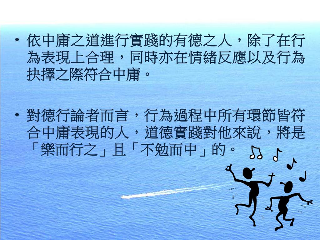 依中庸之道進行實踐的有德之人,除了在行為表現上合理,同時亦在情緒反應以及行為抉擇之際符合中庸。依中庸之道進行實踐的有德之人,除了在行為表現上合理,同時亦在情緒反應以及行為抉擇之際符合中庸。 • 對德行論者而言,行為過程中所有環節皆符合中庸表現的人,道德實踐對他來說,將是「樂而行之」且「不勉而中」的。
