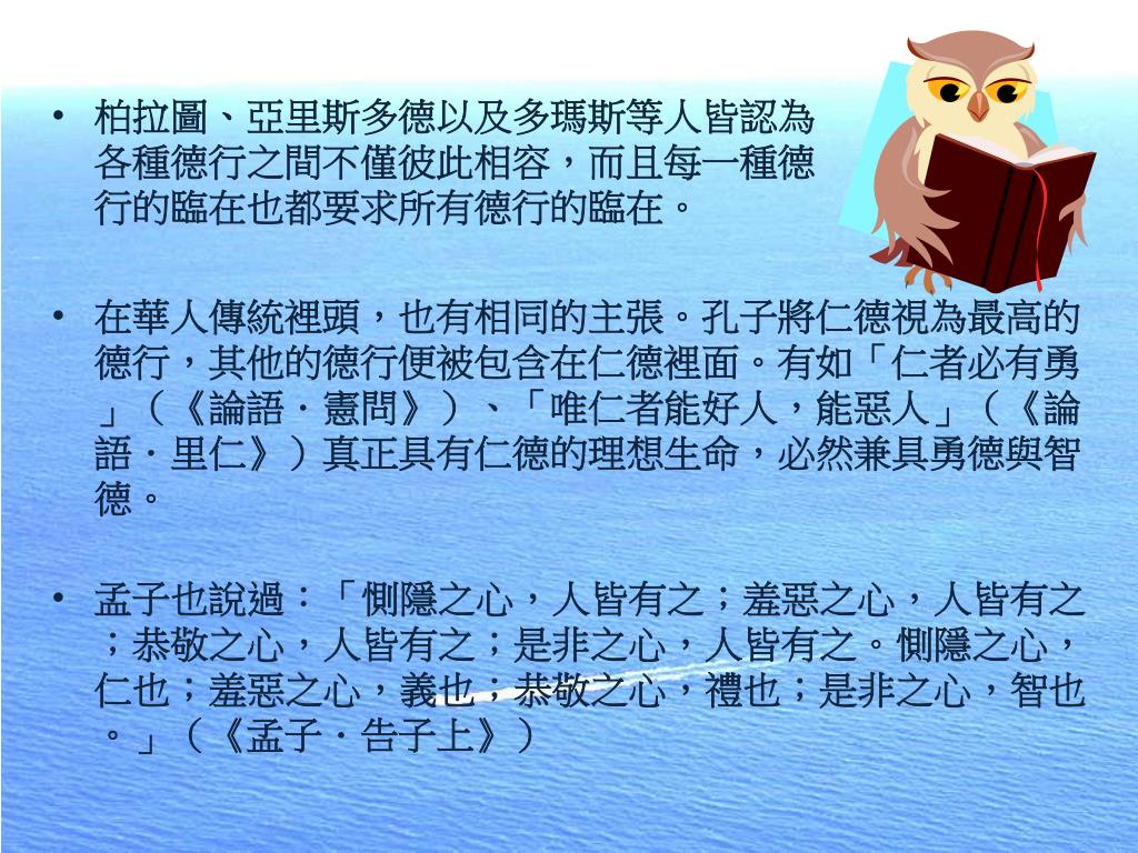 柏拉圖、亞里斯多德以及多瑪斯等人皆認為各種德行之間不僅彼此相容,而且每一種德行的臨在也都要求所有德行的臨在。柏拉圖、亞里斯多德以及多瑪斯等人皆認為各種德行之間不僅彼此相容,而且每一種德行的臨在也都要求所有德行的臨在。 • 在華人傳統裡頭,也有相同的主張。孔子將仁德視為最高的德行,其他的德行便被包含在仁德裡面。有如「仁者必有勇」(《論語.憲問》)、「唯仁者能好人,能惡人」(《論語.里仁》)真正具有仁德的理想生命,必然兼具勇德與智德。 • 孟子也說過:「惻隱之心,人皆有之;羞惡之心,人皆有之;恭敬之心,人皆有之;是非之心,人皆有之。惻隱之心,仁也;羞惡之心,義也;恭敬之心,禮也;是非之心,智也。」(《孟子.告子上》)