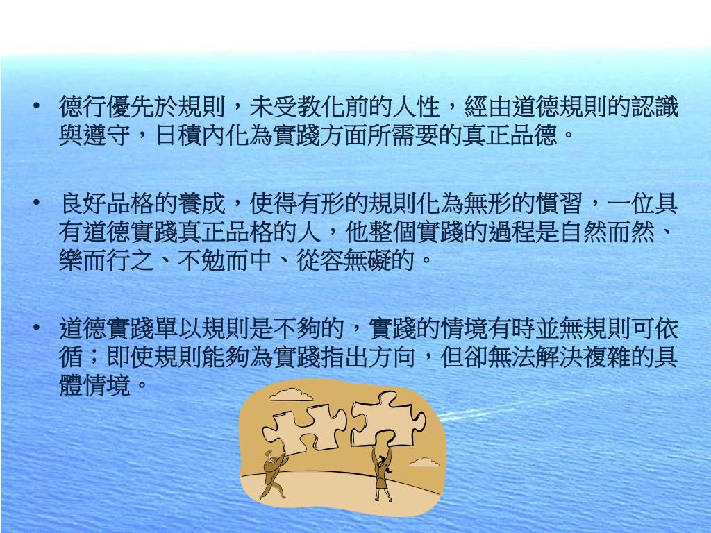 德行優先於規則,未受教化前的人性,經由道德規則的認識與遵守,日積內化為實踐方面所需要的真正品德。德行優先於規則,未受教化前的人性,經由道德規則的認識與遵守,日積內化為實踐方面所需要的真正品德。 • 良好品格的養成,使得有形的規則化為無形的慣習,一位具有道德實踐真正品格的人,他整個實踐的過程是自然而然、樂而行之、不勉而中、從容無礙的。 • 道德實踐單以規則是不夠的,實踐的情境有時並無規則可依循;即使規則能夠為實踐指出方向,但卻無法解決複雜的具體情境。