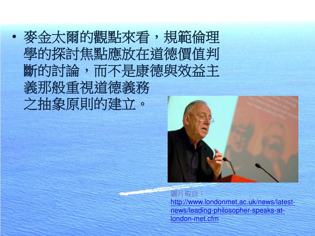 麥金太爾的觀點來看,規範倫理學的探討焦點應放在道德價值判斷的討論,而不是康德與效益主義那般重視道德義務之抽象原則的建立。麥金太爾的觀點來看,規範倫理學的探討焦點應放在道德價值判斷的討論,而不是康德與效益主義那般重視道德義務之抽象原則的建立。 圖片取自:http://www.londonmet.ac.uk/news/latest-news/leading-philosopher-speaks-at-london-met.cfm