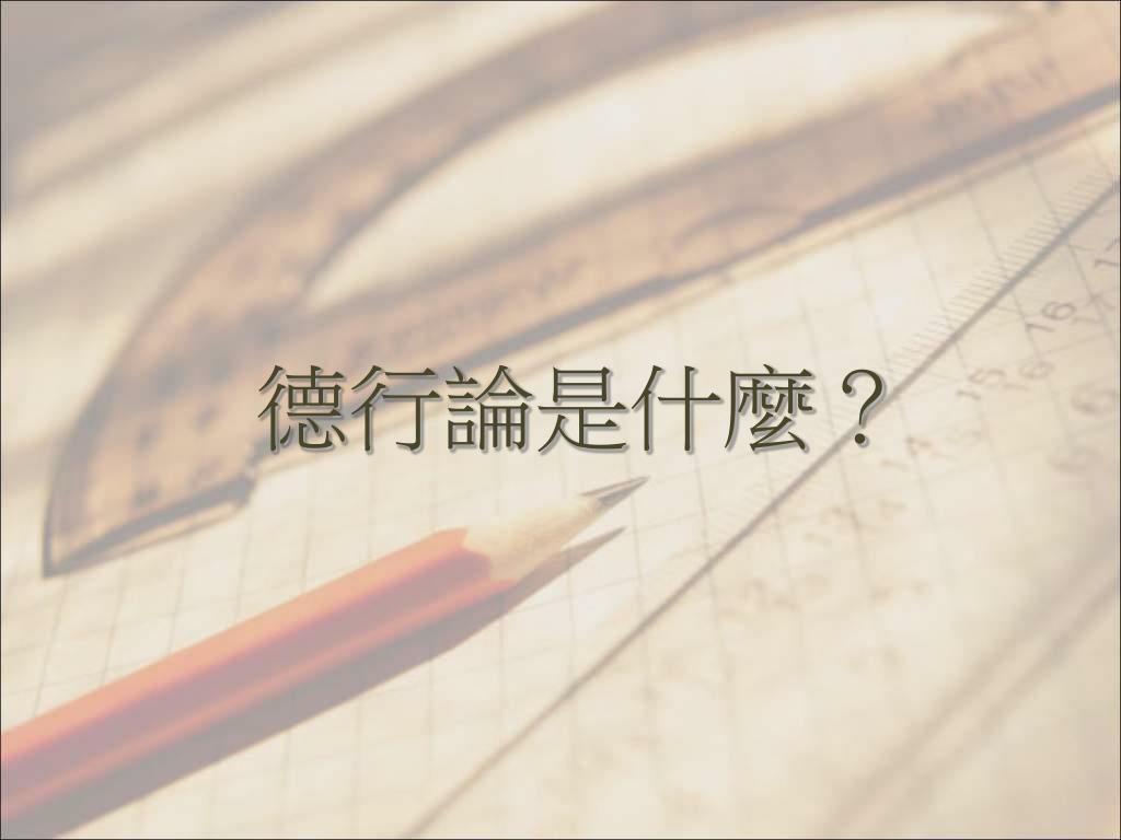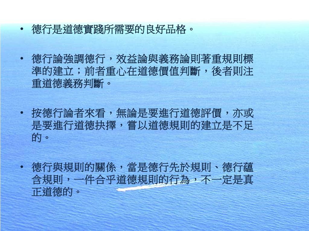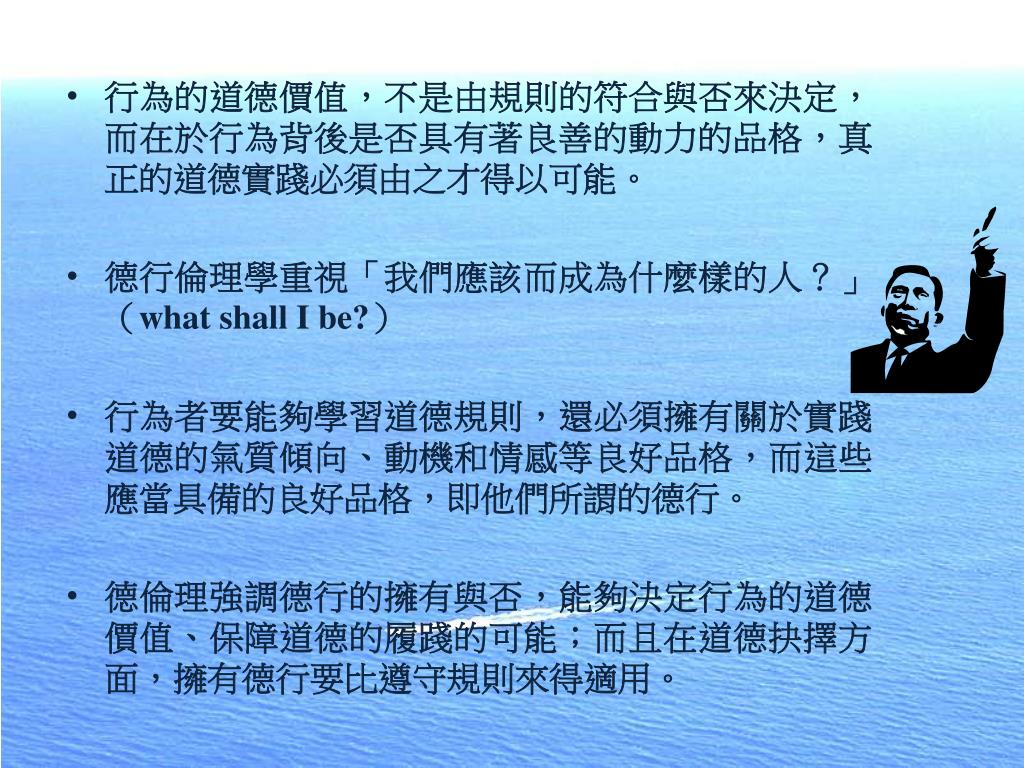 行為的道德價值,不是由規則的符合與否來決定,而在於行為背後是否具有著良善的動力的品格,真正的道德實踐必須由之才得以可能。行為的道德價值,不是由規則的符合與否來決定,而在於行為背後是否具有著良善的動力的品格,真正的道德實踐必須由之才得以可能。 • 德行倫理學重視「我們應該而成為什麼樣的人?」(what shall I be?) • 行為者要能夠學習道德規則,還必須擁有關於實踐道德的氣質傾向、動機和情感等良好品格,而這些應當具備的良好品格,即他們所謂的德行。 • 德倫理強調德行的擁有與否,能夠決定行為的道德價值、保障道德的履踐的可能;而且在道德抉擇方面,擁有德行要比遵守規則來得適用。
