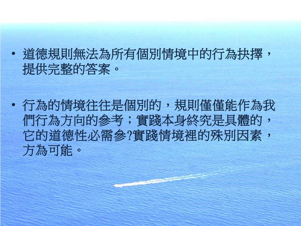 道德規則無法為所有個別情境中的行為抉擇,提供完整的答案。道德規則無法為所有個別情境中的行為抉擇,提供完整的答案。 • 行為的情境往往是個別的,規則僅僅能作為我們行為方向的參考;實踐本身終究是具體的,它的道德性必需參?實踐情境裡的殊別因素,方為可能。