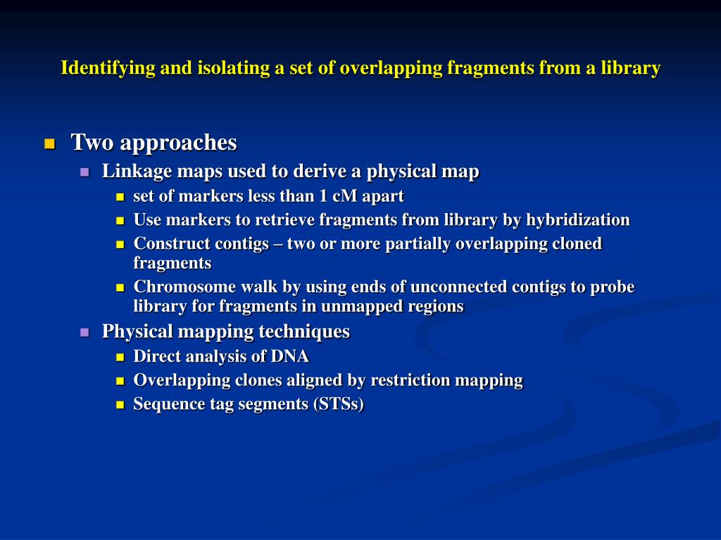 Identifying and isolating a set of overlapping fragments from a library • Two approaches • Linkage maps used to derive a physical map • set of markers less than 1 cM apart • Use markers to retrieve fragments from library by hybridization • Construct contigs – two or more partially overlapping cloned fragments • Chromosome walk by using ends of unconnected contigs to probe library for fragments in unmapped regions • Physical mapping techniques • Direct analysis of DNA • Overlapping clones aligned by restriction mapping • Sequence tag segments (STSs)