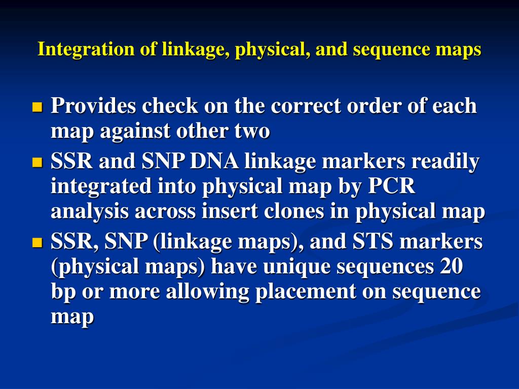 Integration of linkage, physical, and sequence maps • Provides check on the correct order of each map against other two • SSR and SNP DNA linkage markers readily integrated into physical map by PCR analysis across insert clones in physical map • SSR, SNP (linkage maps), and STS markers (physical maps) have unique sequences 20 bp or more allowing placement on sequence map
