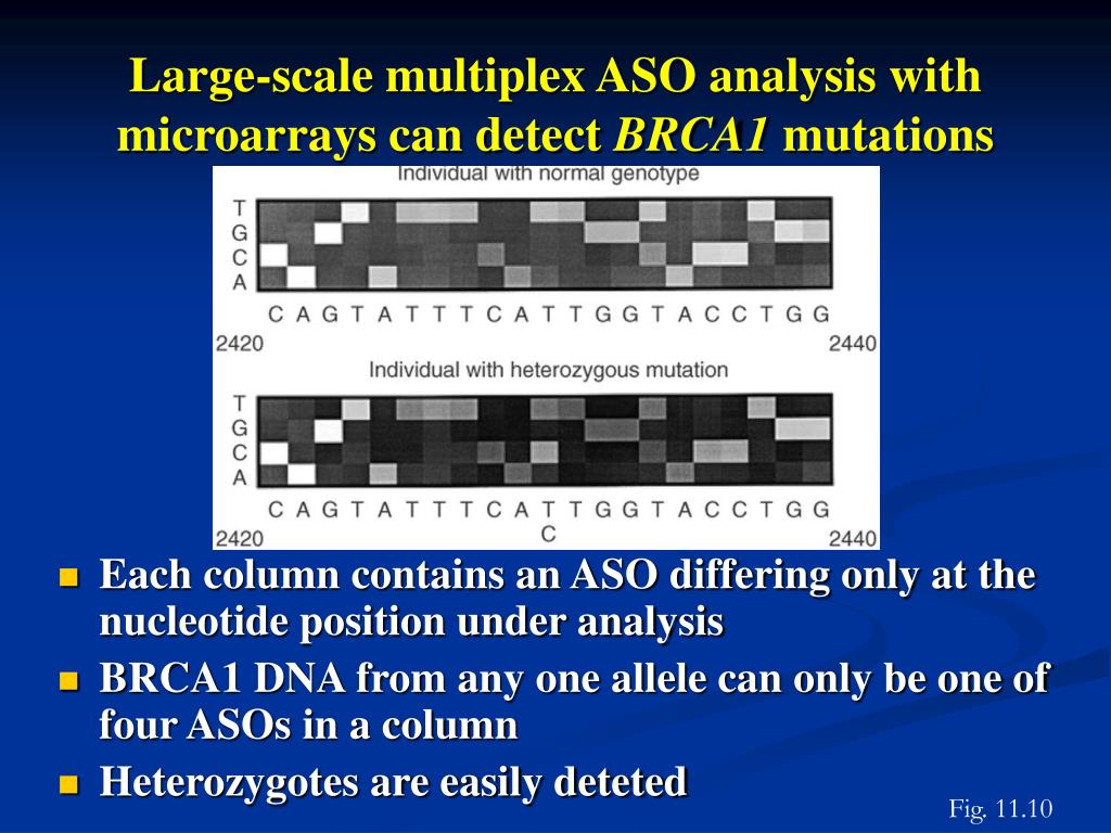 Large-scale multiplex ASO analysis with microarrays can detect BRCA1 mutations • Each column contains an ASO differing only at the nucleotide position under analysis • BRCA1 DNA from any one allele can only be one of four ASOs in a column • Heterozygotes are easily deteted Fig. 11.10
