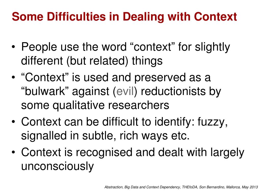 Some Difficulties in Dealing with Context • People use the word “context” for slightly different (but related) things • “Context” is used and preserved as a “bulwark” against (evil) reductionists by some qualitative researchers • Context can be difficult to identify: fuzzy, signalled in subtle, rich ways etc. • Context is recognised and dealt with largely unconsciously