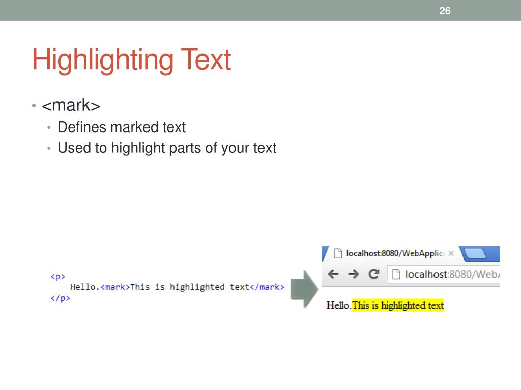 Highlighting Text • <mark> • Defines marked text • Used to highlight parts of your text