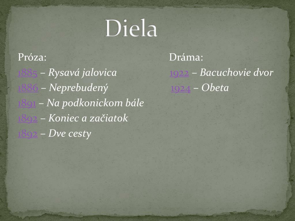 Diela Próza: Dráma: 1885 – Rysavá jalovica1922 – Bacuchovie dvor 1886 – Neprebudený1924 – Obeta 1891 – Na podkonickom bále 1892 – Koniec a začiatok 1892 – Dve cesty