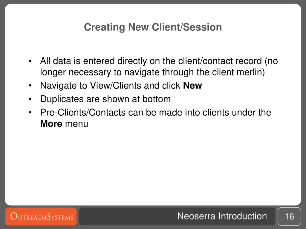 Creating New Client/Session • All data is entered directly on the client/contact record (no longer necessary to navigate through the client merlin) • Navigate to View/Clients and click New • Duplicates are shown at bottom • Pre-Clients/Contacts can be made into clients under the More menu
