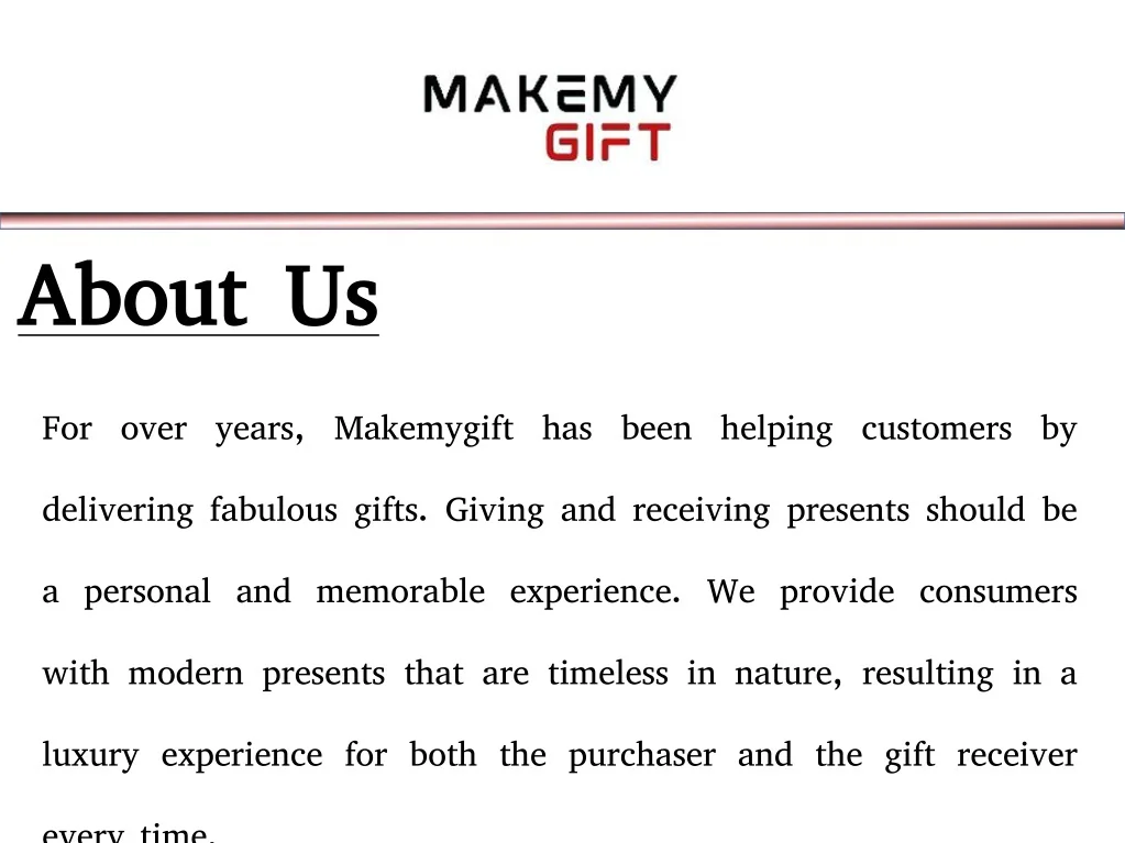 About Us For over years, Makemygift has been helping customers by delivering fabulous gifts. Giving and receiving presents should be a personal and memorable experience. We provide consumers with modern presents that are timeless in nature, resulting in a luxury experience for both the purchaser and the gift receiver every time.