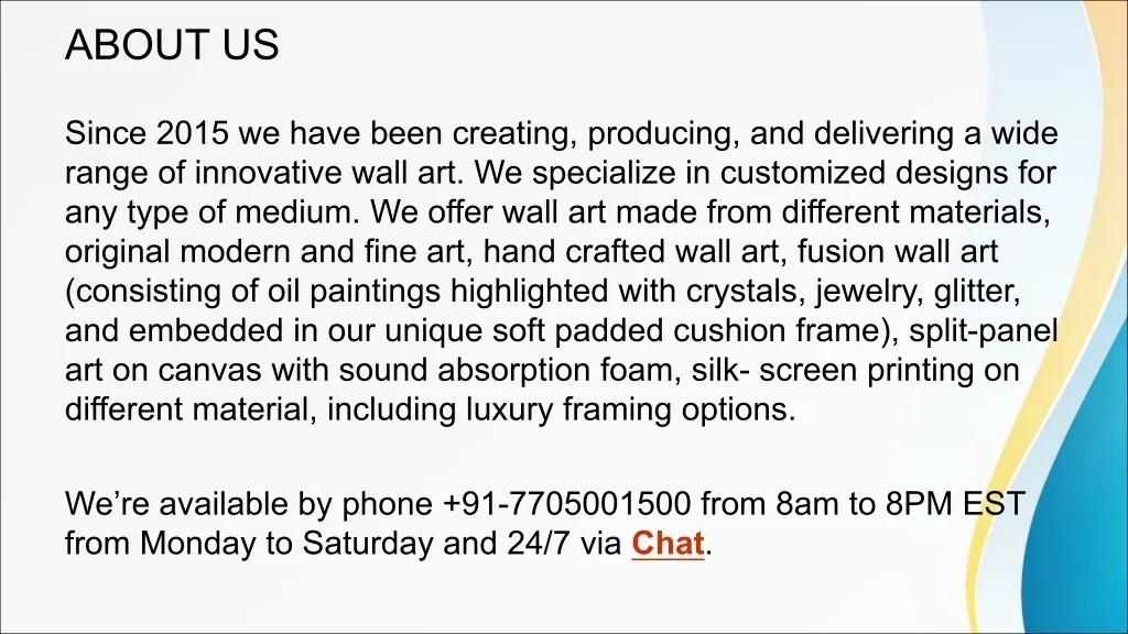 ABOUT US Since 2015 we have been creating, producing, and delivering a wide range of innovative wall art. We specialize in customized designs for any type of medium. We offer wall art made from different materials, original modern and fine art, hand crafted wall art, fusion wall art (consisting of oil paintings highlighted with crystals, jewelry, glitter, and embedded in our unique soft padded cushion frame), split-panel art on canvas with sound absorption foam, silk- screen printing on different material, including luxury framing options. We’re available by phone +91-7705001500 from 8am to 8PM EST from Monday to Saturday and 24/7 via Chat.