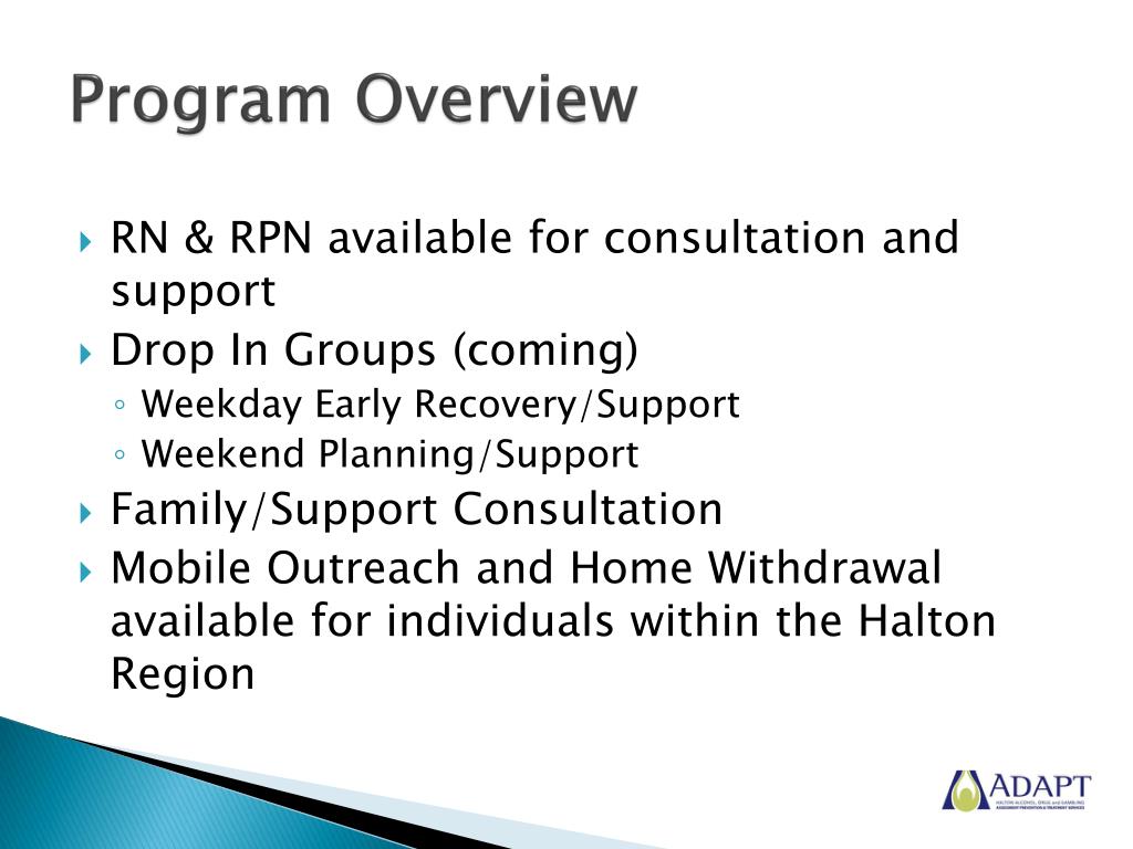 Program Overview • RN & RPN available for consultation and support • Drop In Groups (coming) • Weekday Early Recovery/Support • Weekend Planning/Support • Family/Support Consultation • Mobile Outreach and Home Withdrawal available for individuals within the Halton Region