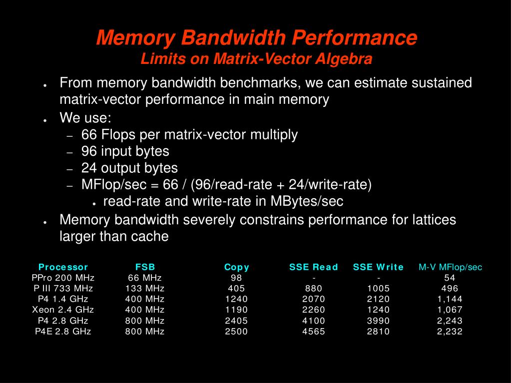 Memory Bandwidth PerformanceLimits on Matrix-Vector Algebra • From memory bandwidth benchmarks, we can estimate sustained matrix-vector performance in main memory • We use: • 66 Flops per matrix-vector multiply • 96 input bytes • 24 output bytes • MFlop/sec = 66 / (96/read-rate + 24/write-rate) • read-rate and write-rate in MBytes/sec • Memory bandwidth severely constrains performance for lattices larger than cache