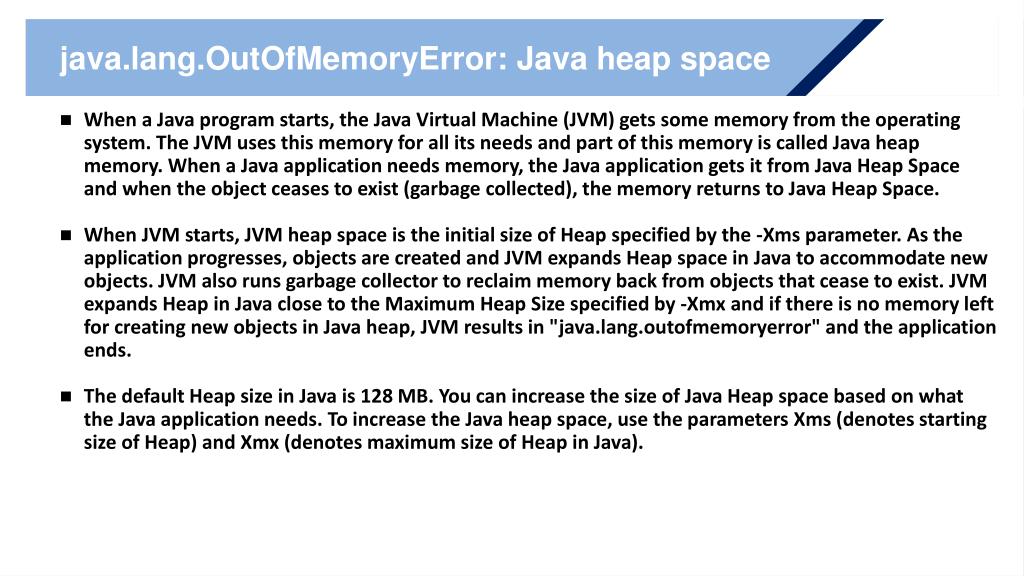 java.lang.OutOfMemoryError: Java heap space • When a Java program starts, the Java Virtual Machine (JVM) gets some memory from the operating system. The JVM uses this memory for all its needs and part of this memory is called Java heap memory. When a Java application needs memory, the Java application gets it from Java Heap Space and when the object ceases to exist (garbage collected), the memory returns to Java Heap Space. • When JVM starts, JVM heap space is the initial size of Heap specified by the -Xms parameter. As the application progresses, objects are created and JVM expands Heap space in Java to accommodate new objects. JVM also runs garbage collector to reclaim memory back from objects that cease to exist. JVM expands Heap in Java close to the Maximum Heap Size specified by -Xmx and if there is no memory left for creating new objects in Java heap, JVM results in "java.lang.outofmemoryerror" and the application ends. • The default Heap size in Java is 128 MB. You can increase the size of Java Heap space based on what the Java application needs. To increase the Java heap space, use the parameters Xms (denotes starting size of Heap) and Xmx (denotes maximum size of Heap in Java).