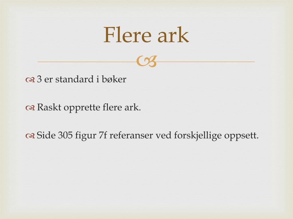 Flere ark • 3 er standard i bøker • Raskt opprette flere ark. • Side 305 figur 7f referanser ved forskjellige oppsett.