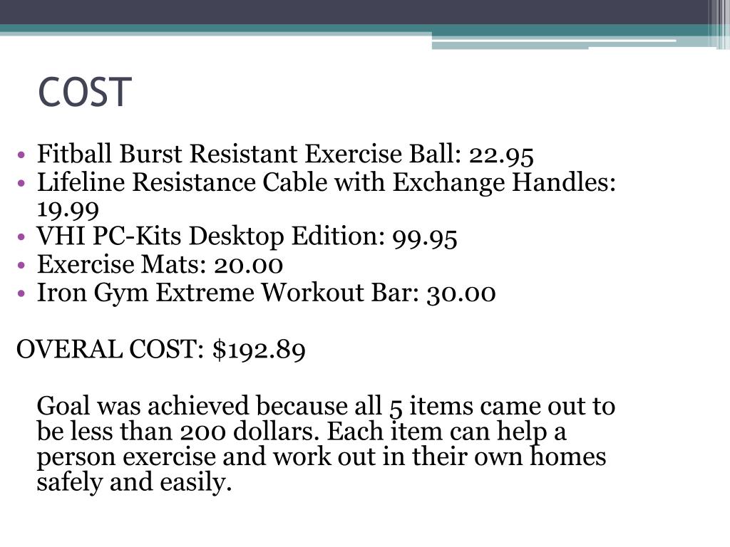 COST • Fitball Burst Resistant Exercise Ball: 22.95 • Lifeline Resistance Cable with Exchange Handles: 19.99 • VHI PC-Kits Desktop Edition: 99.95 • Exercise Mats: 20.00 • Iron Gym Extreme Workout Bar: 30.00 OVERAL COST: $192.89 Goal was achieved because all 5 items came out to be less than 200 dollars. Each item can help a person exercise and work out in their own homes safely and easily.