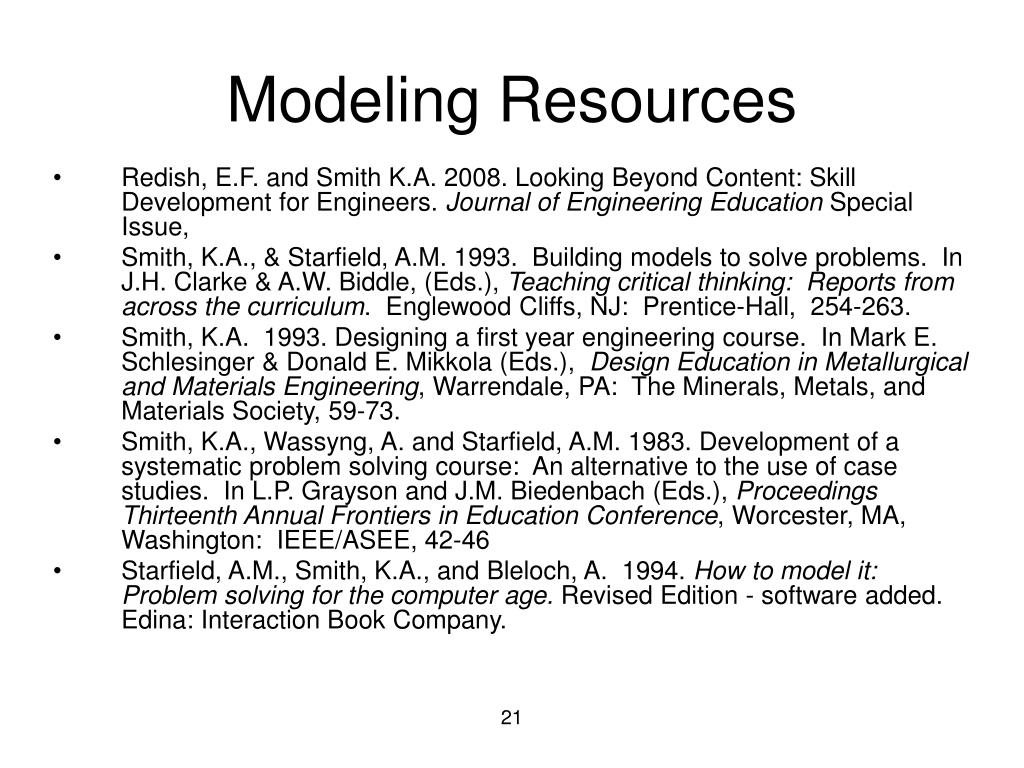Modeling Resources • Redish, E.F. and Smith K.A. 2008. Looking Beyond Content: Skill Development for Engineers. Journal of Engineering Education Special Issue, • Smith, K.A., & Starfield, A.M. 1993. Building models to solve problems. In J.H. Clarke & A.W. Biddle, (Eds.), Teaching critical thinking: Reports from across the curriculum. Englewood Cliffs, NJ: Prentice-Hall, 254-263. • Smith, K.A. 1993. Designing a first year engineering course. In Mark E. Schlesinger & Donald E. Mikkola (Eds.), Design Education in Metallurgical and Materials Engineering, Warrendale, PA: The Minerals, Metals, and Materials Society, 59-73. • Smith, K.A., Wassyng, A. and Starfield, A.M. 1983. Development of a systematic problem solving course: An alternative to the use of case studies. In L.P. Grayson and J.M. Biedenbach (Eds.), Proceedings Thirteenth Annual Frontiers in Education Conference, Worcester, MA, Washington: IEEE/ASEE, 42‑46 • Starfield, A.M., Smith, K.A., and Bleloch, A. 1994. How to model it: Problem solving for the computer age. Revised Edition - software added. Edina: Interaction Book Company. 21