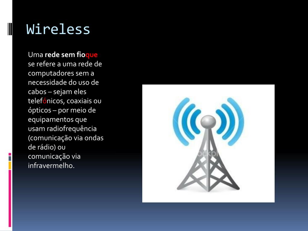 Wireless Uma rede sem fioque se refere a uma rede de computadores sem a necessidade do uso de cabos – sejam eles telefónicos, coaxiais ou ópticos – por meio de equipamentos que usam radiofrequência (comunicação via ondas de rádio) ou comunicação via infravermelho.